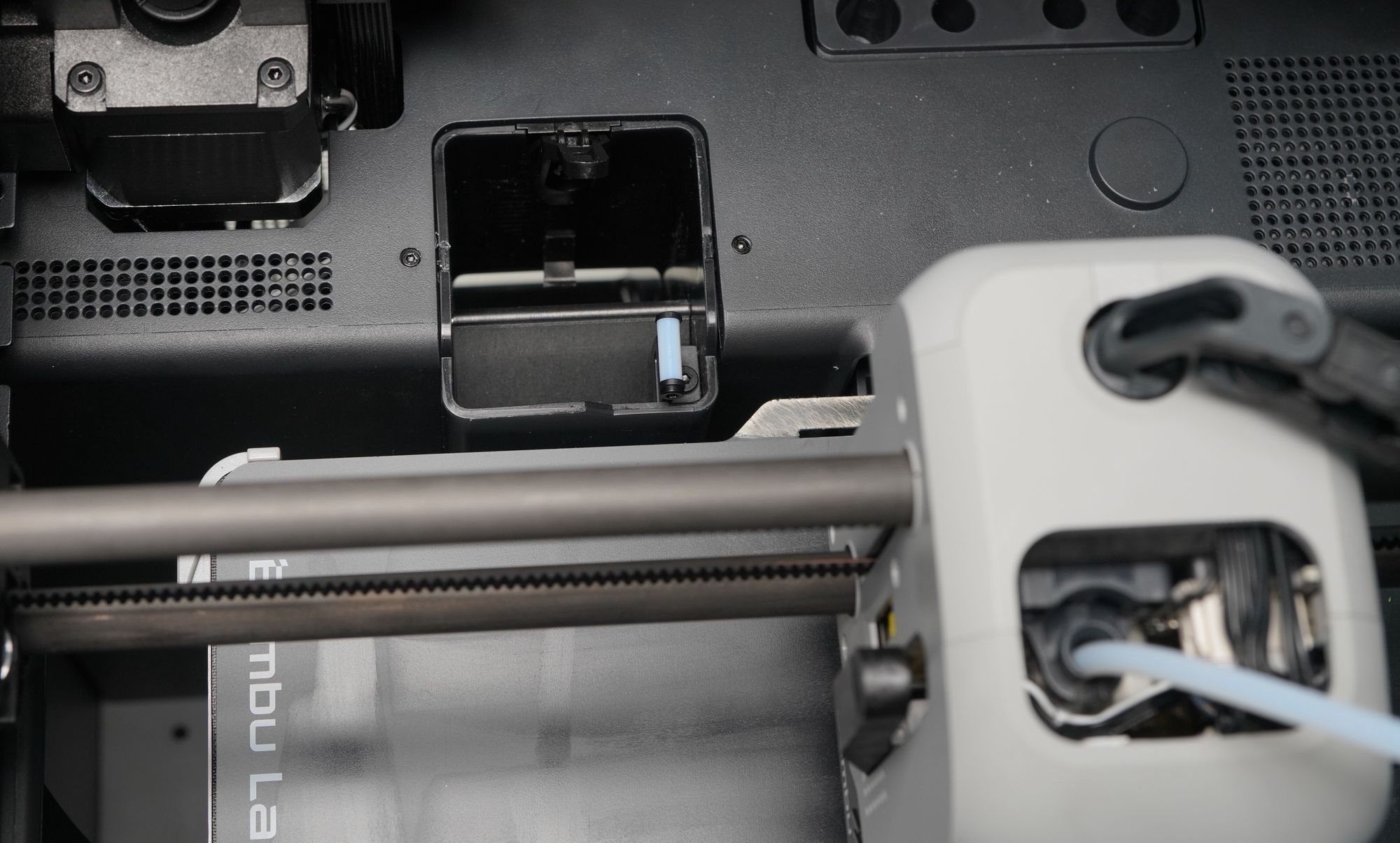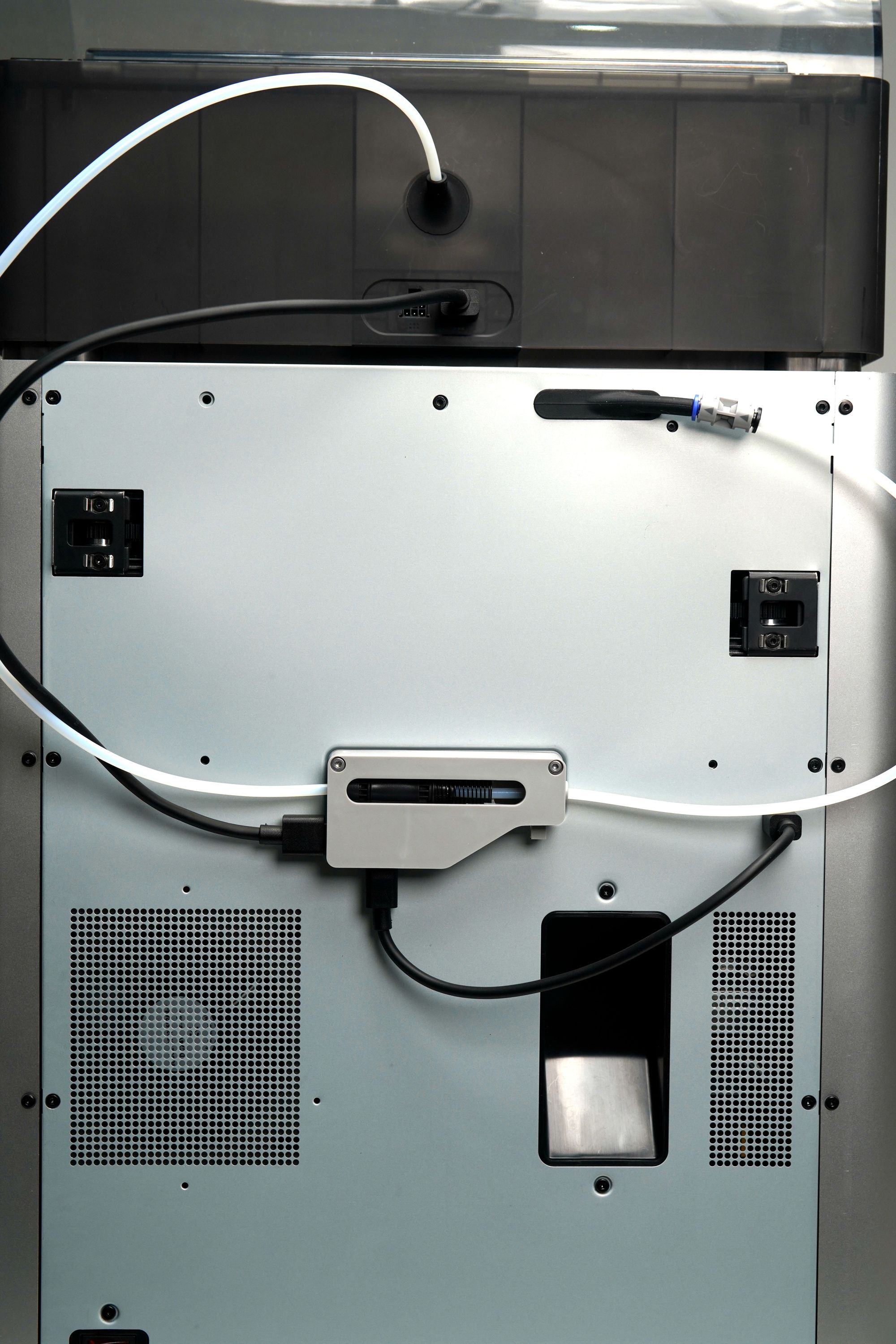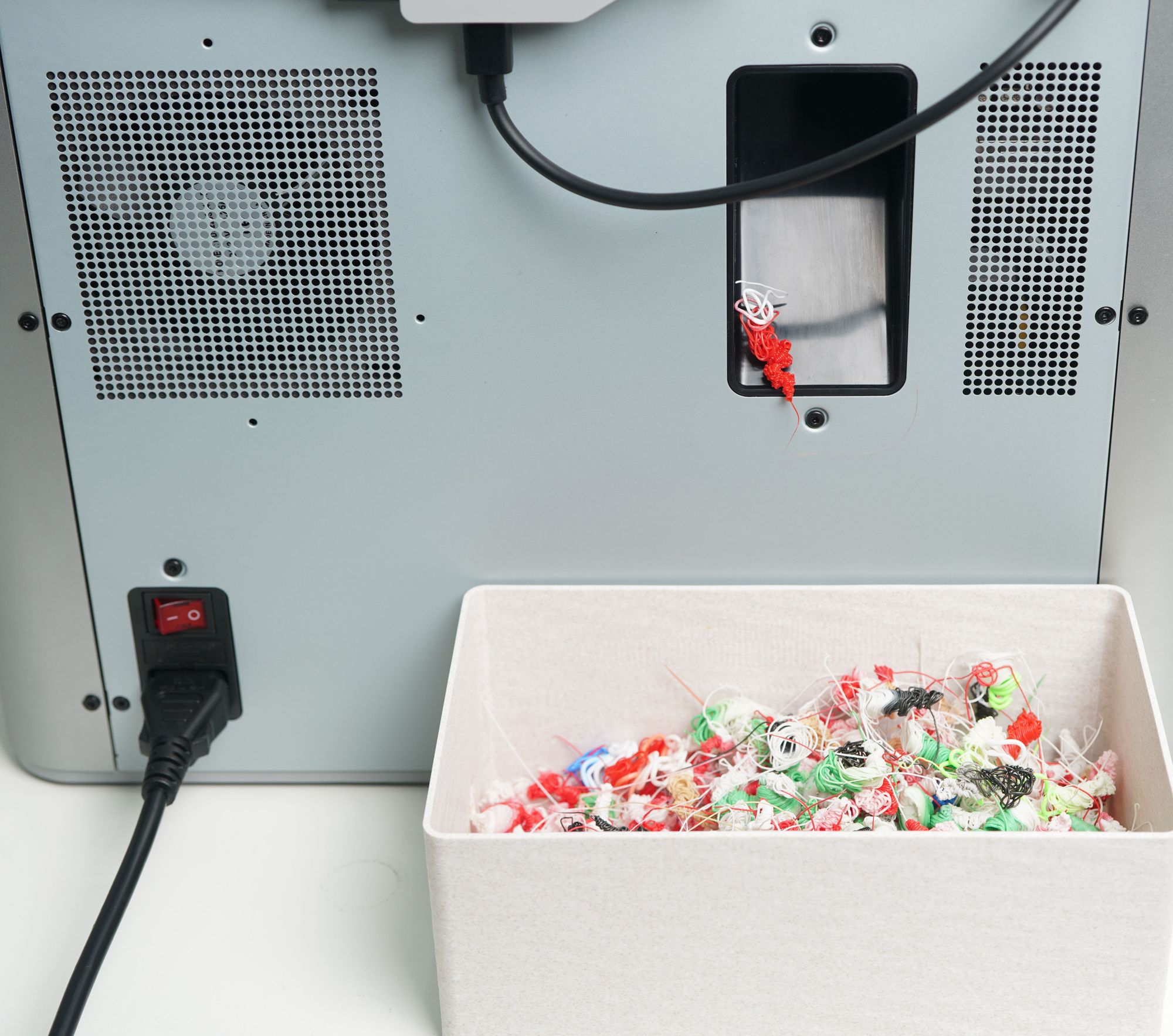 Besides all these parts taking care of the filament feeding, the whole system is airtight, and a humidity sensor is in place. Silicon rubber O-rings are installed to make sure moisture cannot get in to ruin hydroscopic filaments, such as PA and PC. On the Printer side, we have a new trash slide for the purged material to reduce the time used in printing purge towers and a filament cutter on the toolhead to cut off unwanted filament.
