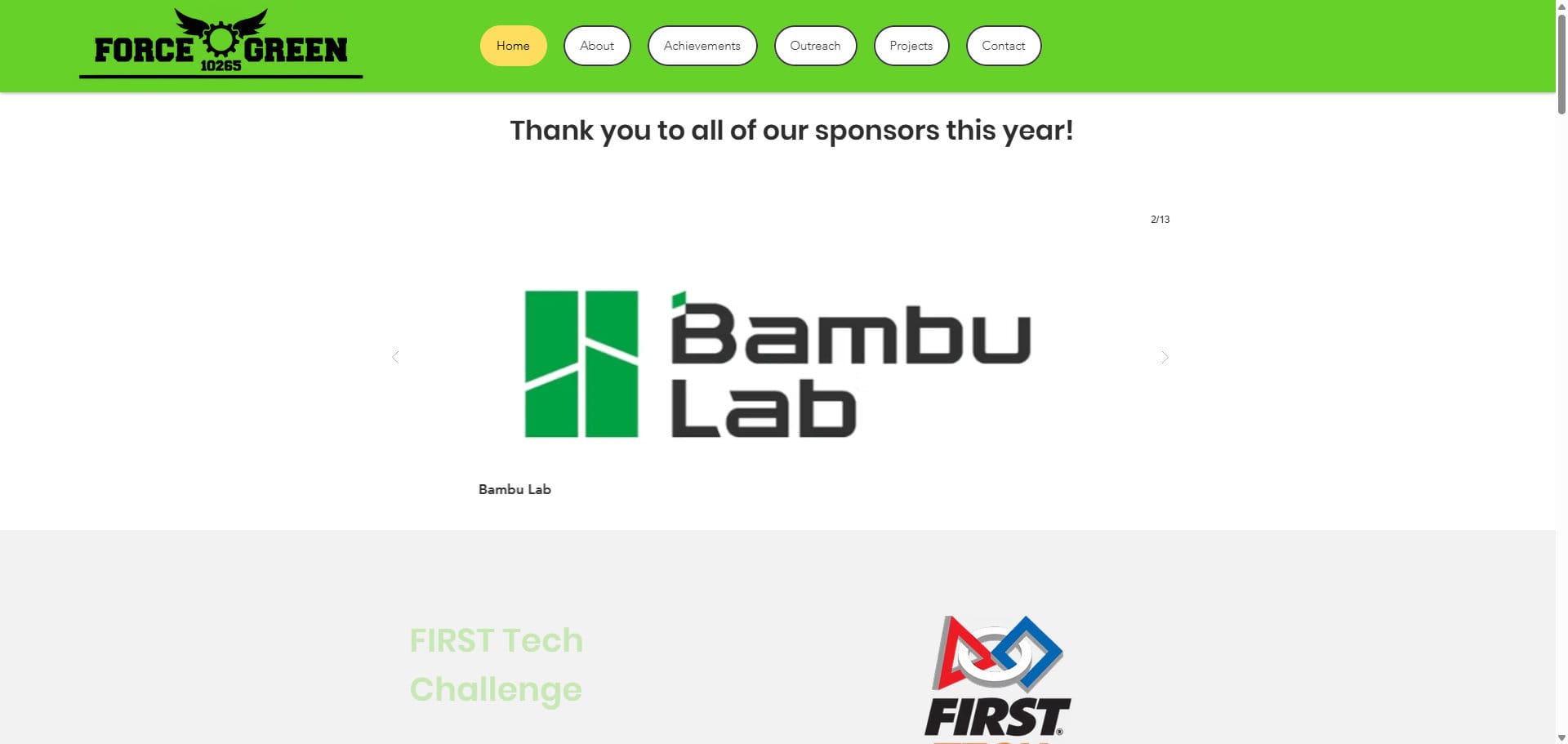 As a community-based high school robotics team, Force Green competes in the FIRST Tech Challenge, where students learn to design, build, and program competitive robots while developing collaboration and leadership skills.