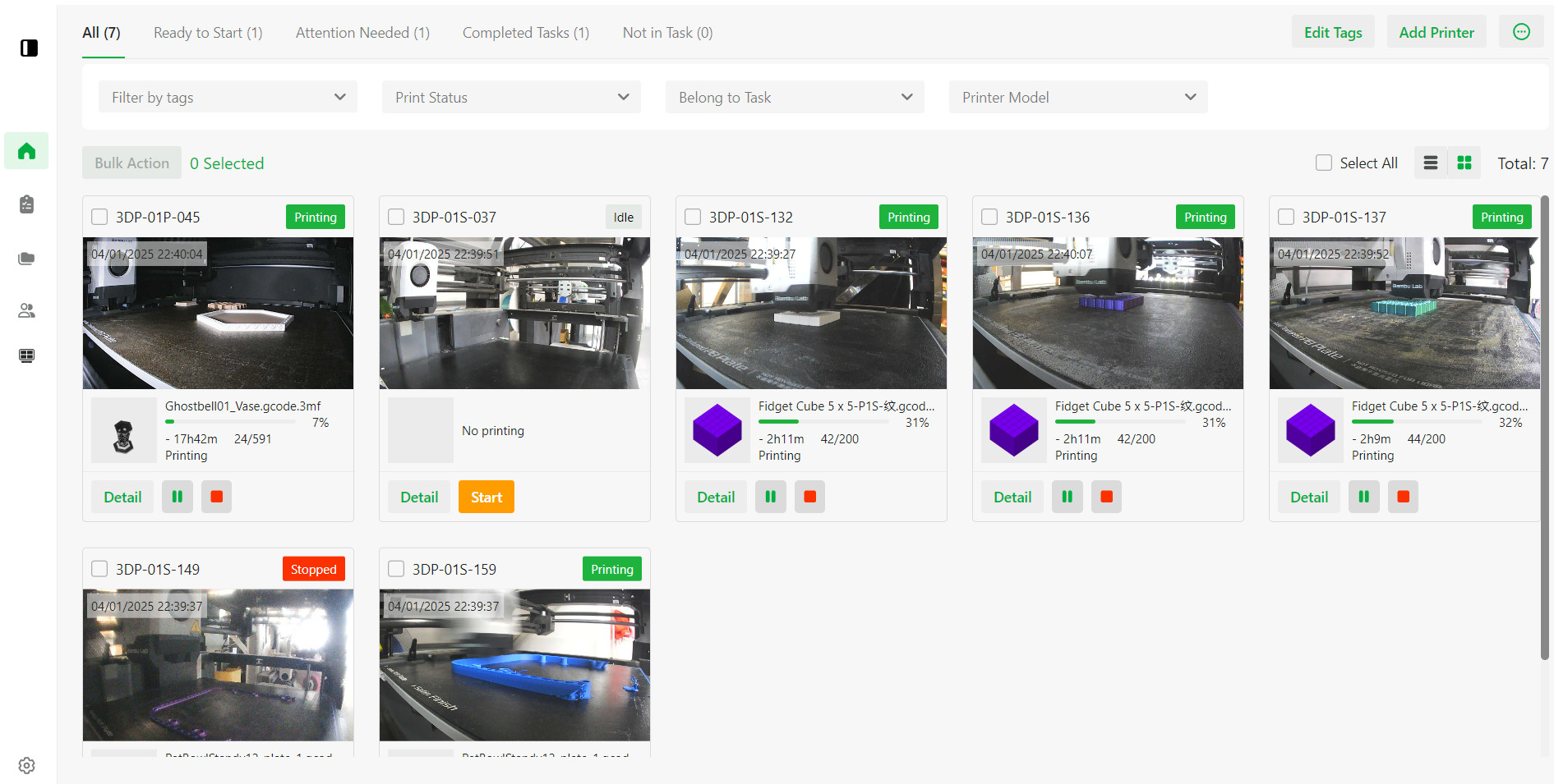 - Real-time monitoring: Keep an eye on every printer’s progress at a glance