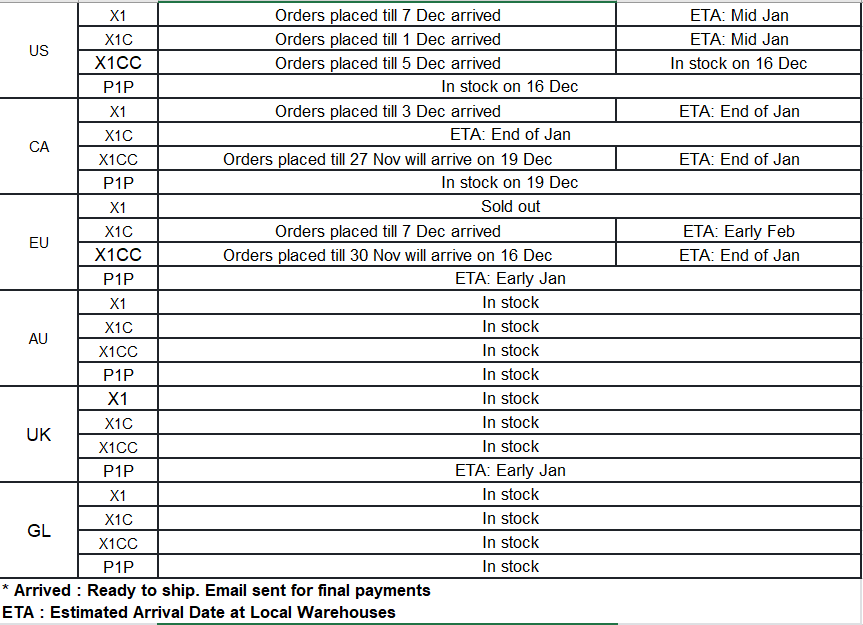 One last thing, we heard good news from our logistic partner that some containers arrive in the local warehouses early. So in some countries, P1P will be delivered early, before the Christmas. And X1 will be in stock in many countries starting this month. Here is the table of ETA of all the pre-order units.