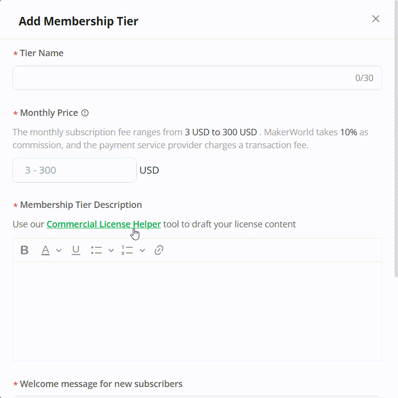 You can customize subscription tier name, monthly price, details of the commercial license itself, and the welcome message for new subscribers.