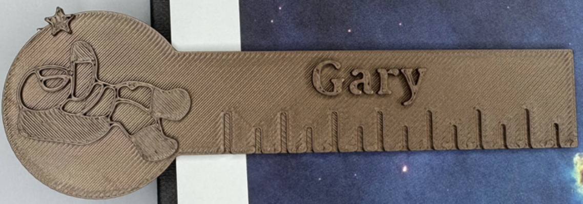 "With my dad's help, I imported my school's logo into Tinkercad and simplified it into an astronaut reaching for a star," Gary explains. His mom helped fine-tune the design, adding a ruler feature that fits 14 characters for easy personalization. "We did it all on the computer," Gary says proudly.