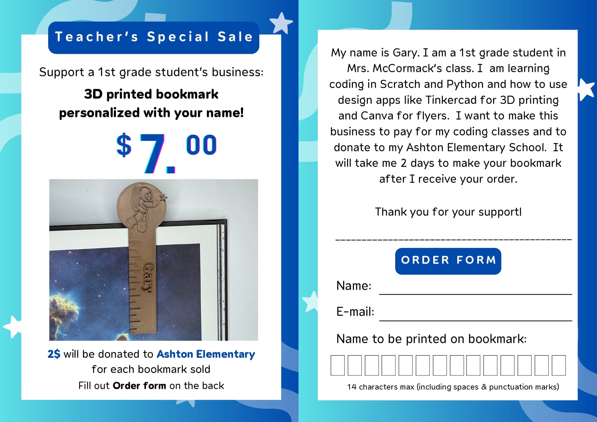 "What began as a simple, thoughtful gift quickly turned into something much bigger. "Over the next few weeks, other friends and teachers started asking for bookmarks," Gary recalls. "So, I kept printing them and giving them out as gifts."