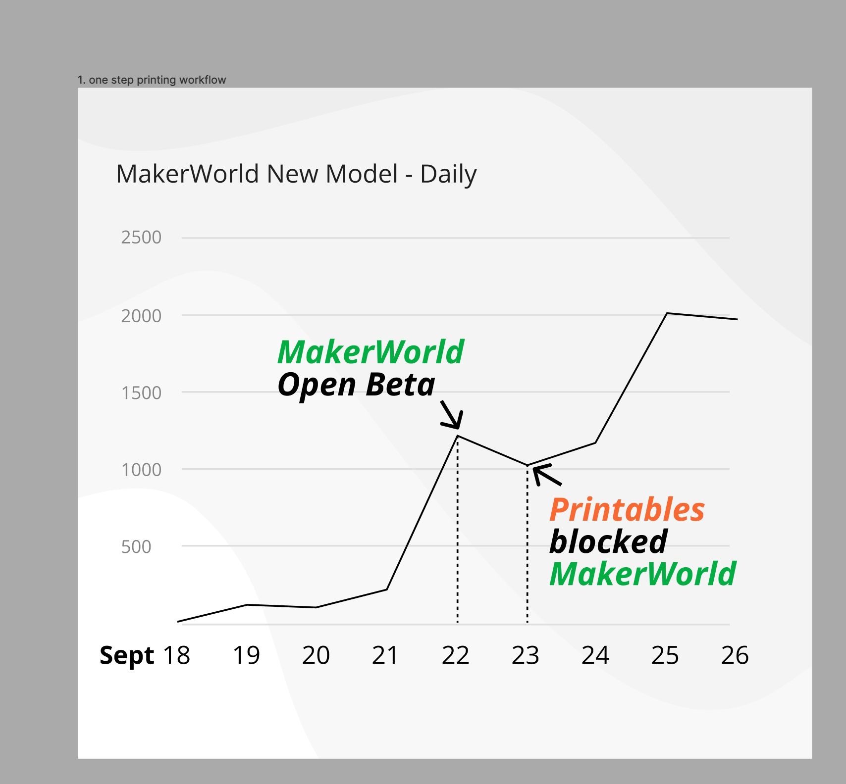 There was a spike in the number of models imported on day one, but after 24 hours, we observed a sharp decline in uploads and received several reports from users about difficulties using the import feature. This prompted us to further investigate. Subsequently, we found that imports from Printables were blocked.