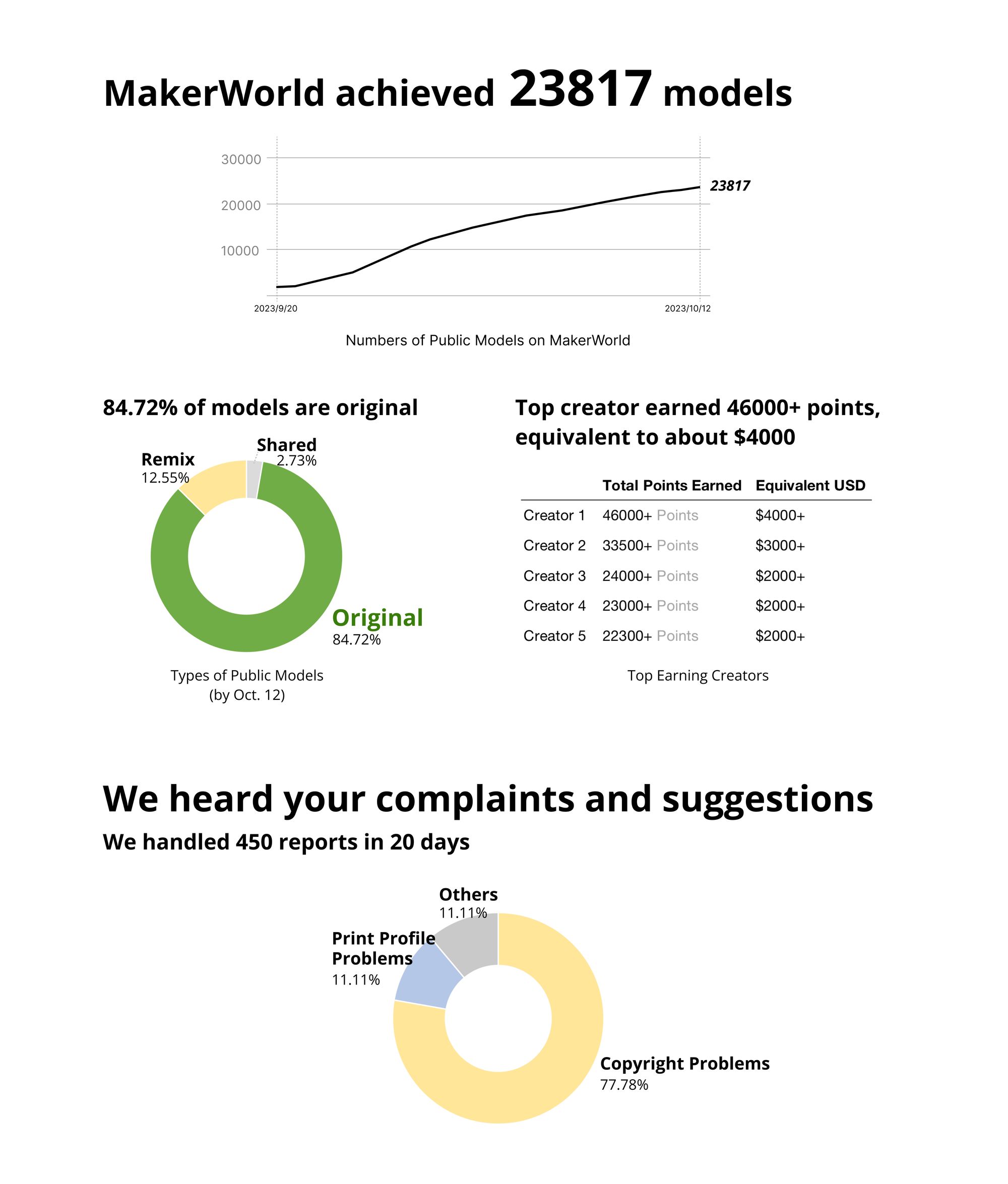 MakerWorld is in its Beta phase and there are so many things that need to be improved. We value everyone's feedback and opinions. Many of the adjustments mentioned above are the results of the constructive feedback we received from comments on social media, reports on the platform, and even friendly emails. If you have any additional suggestions or concerns, please do not hesitate to reach out to us via the support system of MakerWorld.