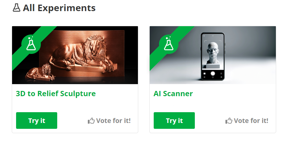 Only two tools are currently available: the 3D to Relief Sculpture and AI Scanner. Although still in their early stages, both of them are quite innovative and interesting. The Scanner also incorporates the currently popular AI generation technology.
