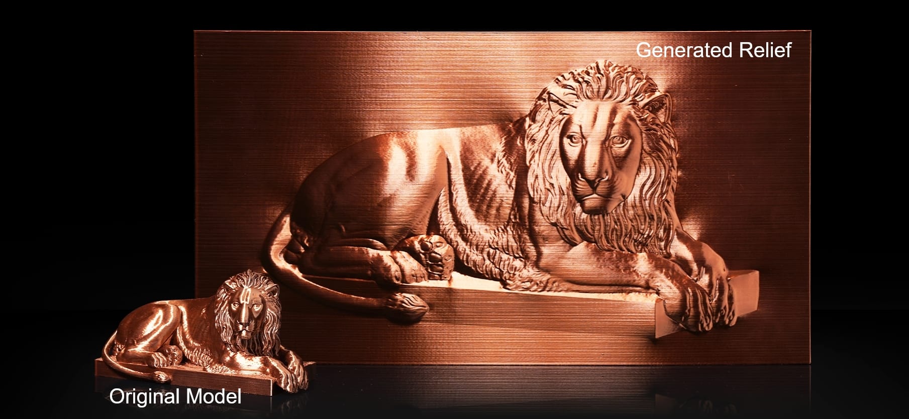 3D to Relief Sculpture is a tool we came up with through contrarian thinking, allowing you to compose unique relief art from your favorite 3D models. Simply import one or several models you like, choose the desired perspective, fine-tune parameters, and frame your shot. After framing the perspective of your selected model, the algorithm will automatically calculate the depth of the model from that perspective to generate relief art.