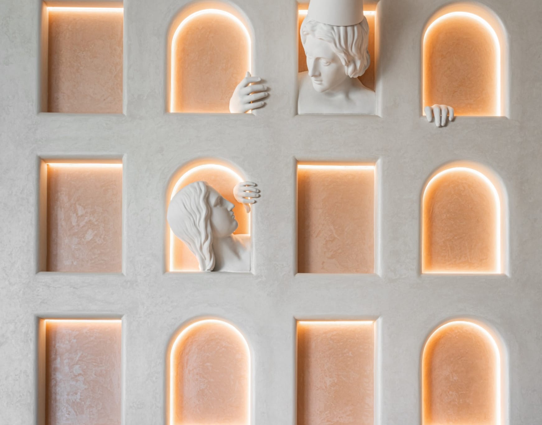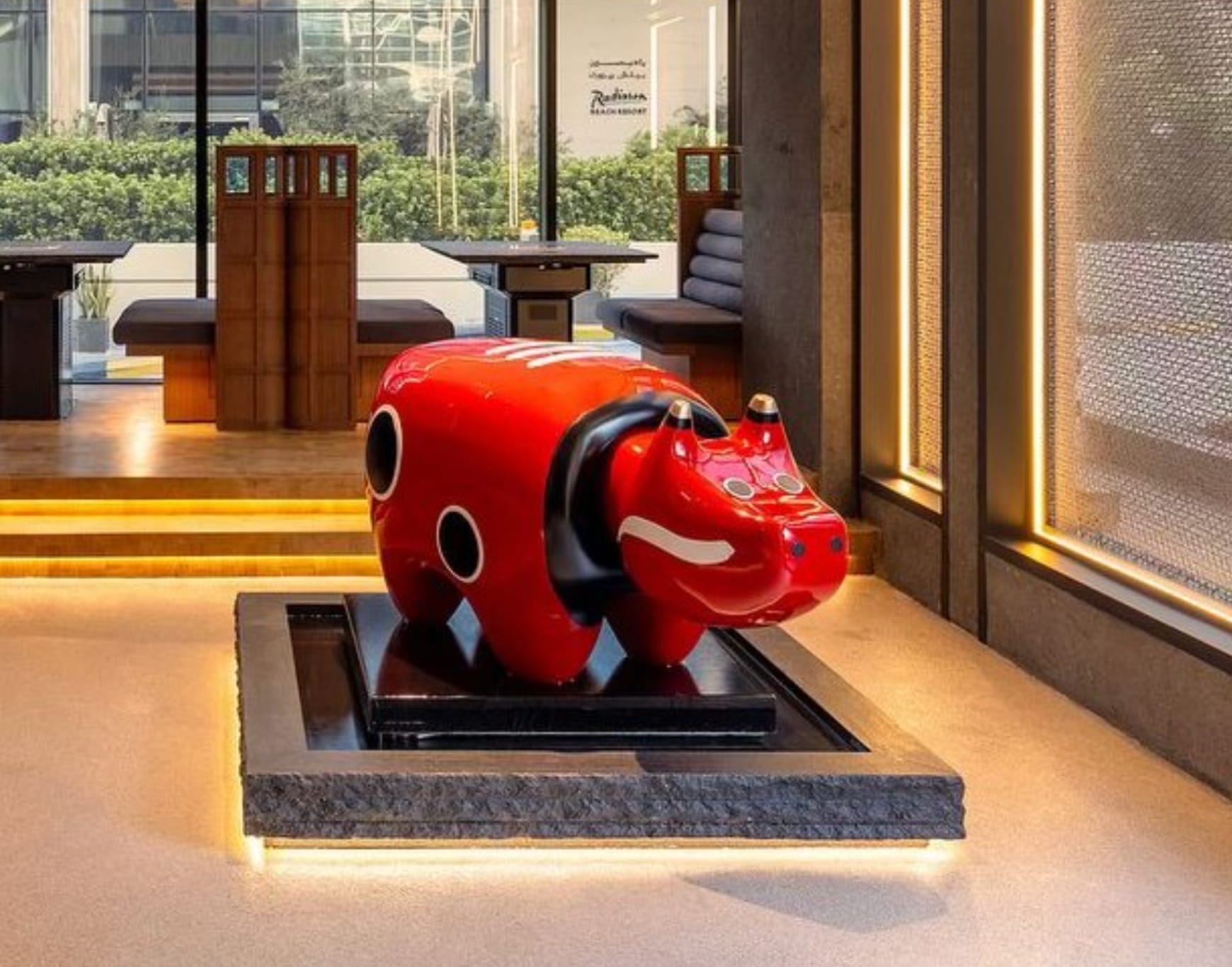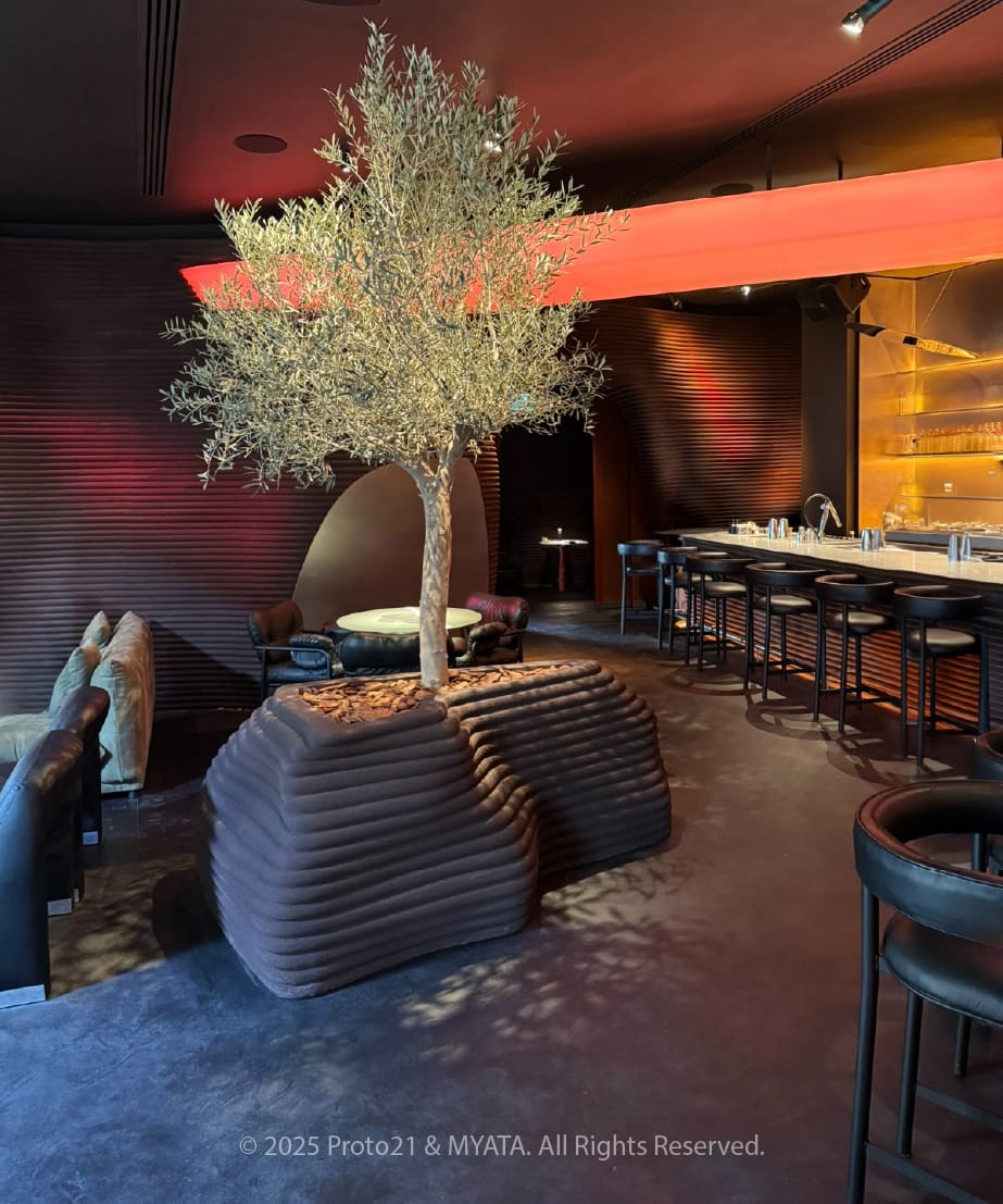 The installation decorates the luxurious MYATA Platinum restaurant in Dubai’s City Walk, with canyon-inspired designs finished in a natural sand texture.