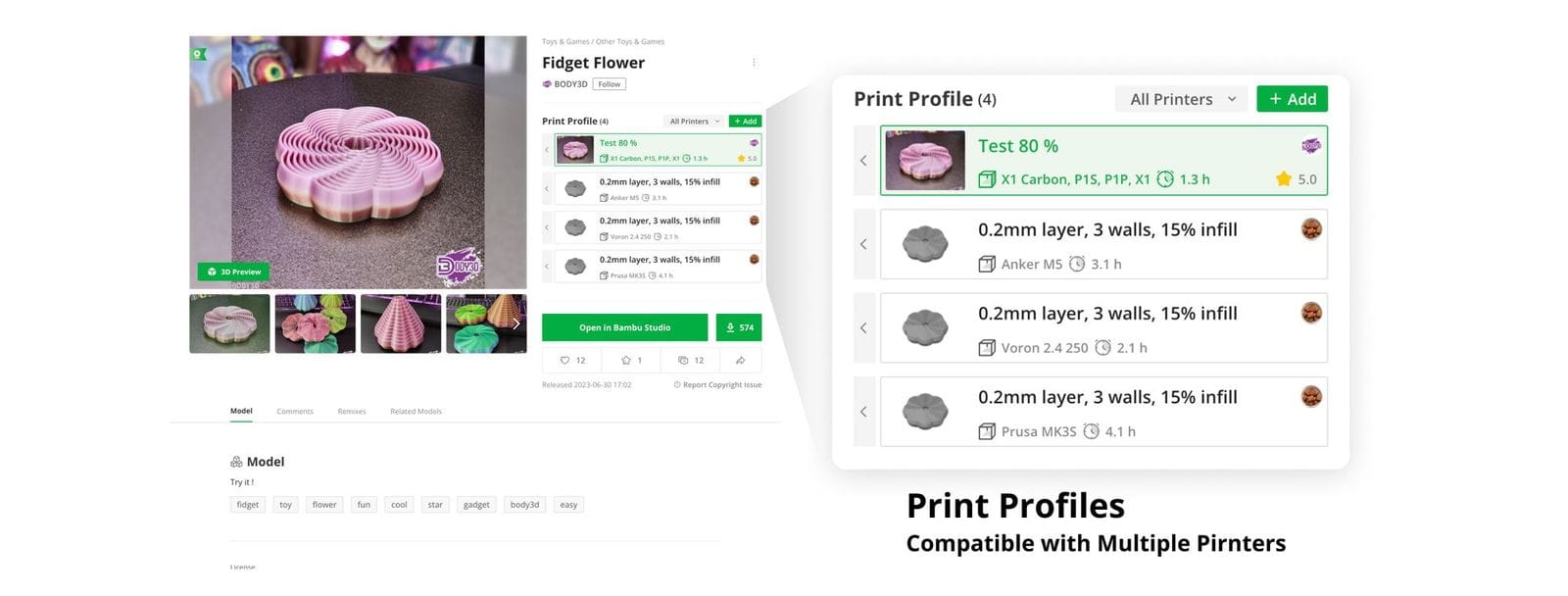 Every model comes with a print profile already optimized for Bambu Lab printers. The entry barrier for new users has practically disappeared.