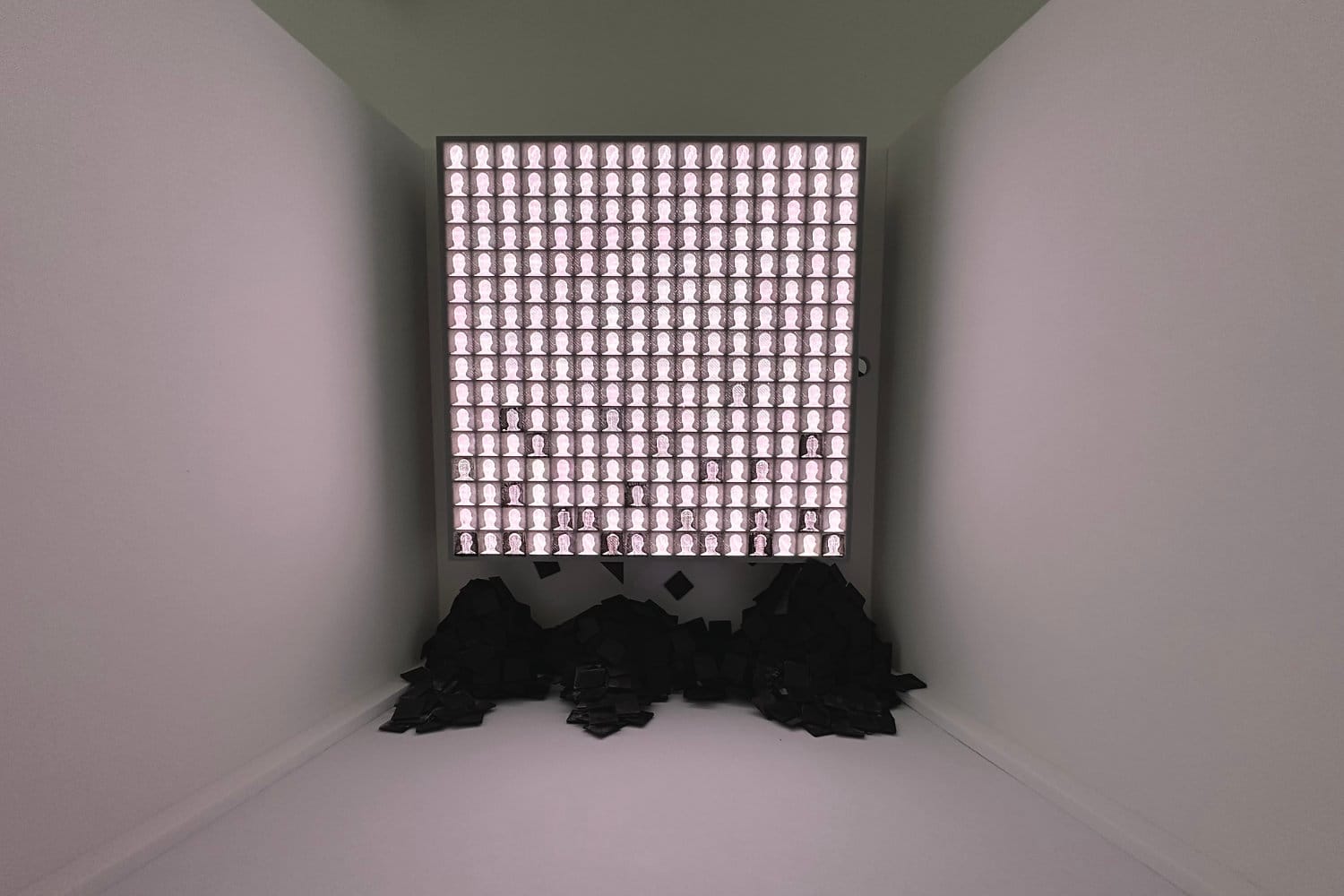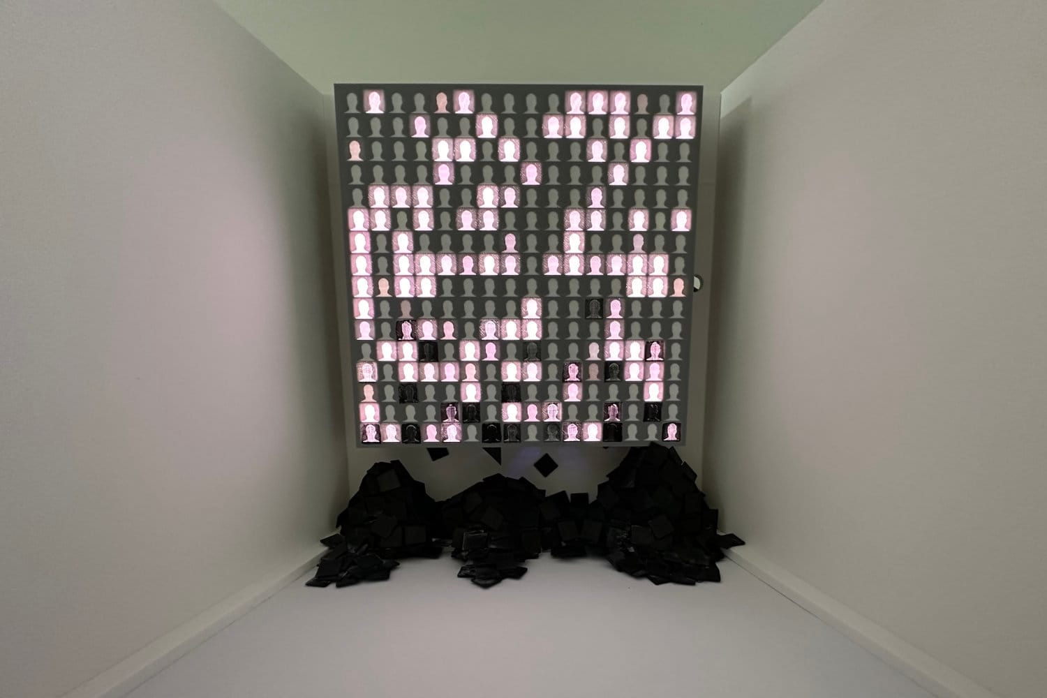 Without illumination, the installation looks “dull and lifeless.” When the lights turn on, details and the “soul” of the portraits are revealed. The light then slowly flickers and fades, evoking the sporadic muscle twitches – fasciculations - experienced by people with ALS.