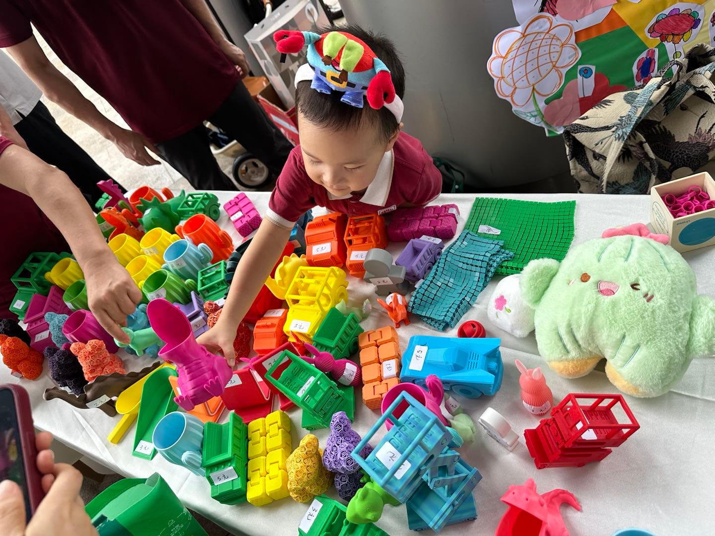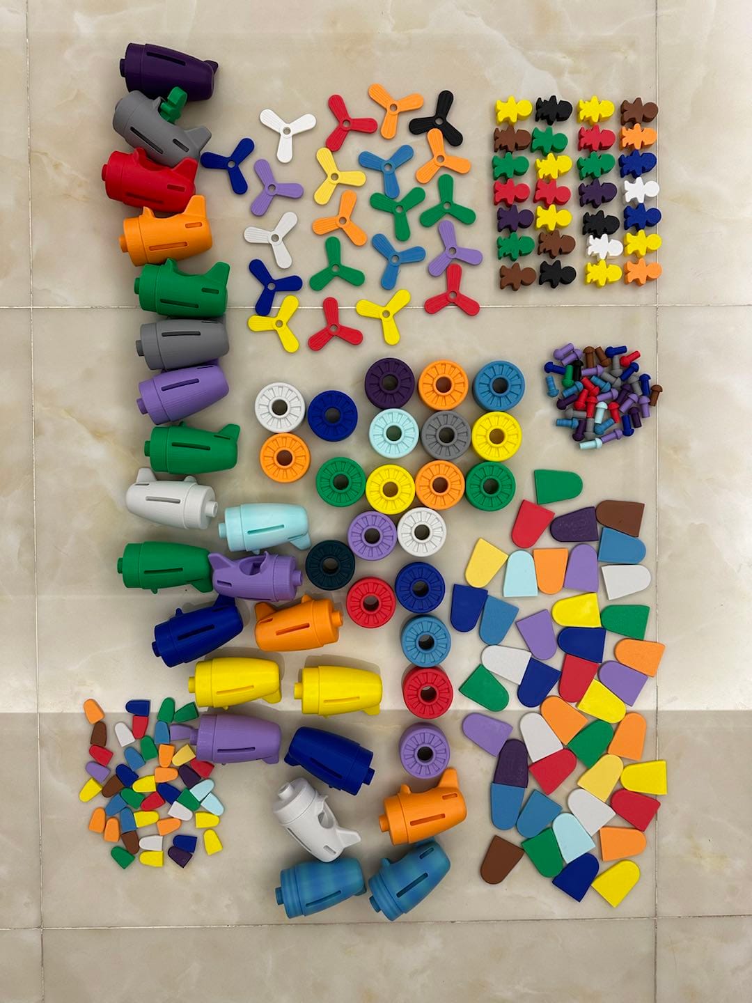 Left: 3D printed objects from Lindy at the school charity sale. Right: 3D printed toy kits for the classroom.