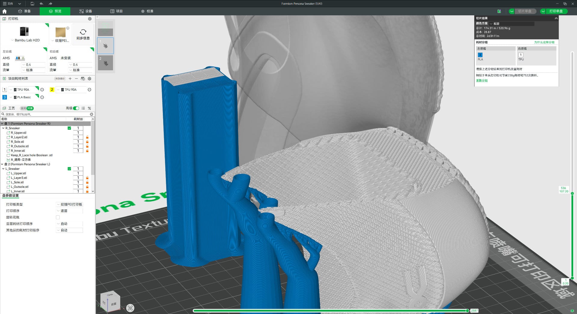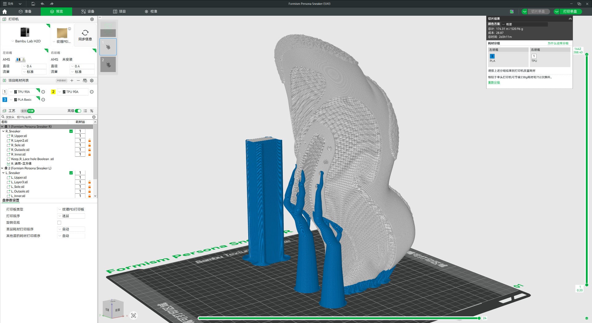 On the material side, the rapid development of flexible filaments has given FFF-printed shoes a strong performance foundation. On the parameter side, Wei approaches slicing much like a traditional shoemaker, carefully adjusting the settings of each part of the shoe.