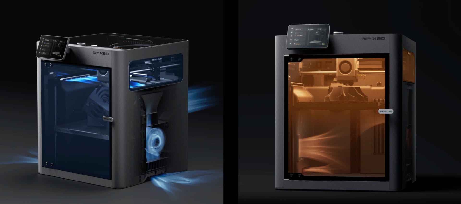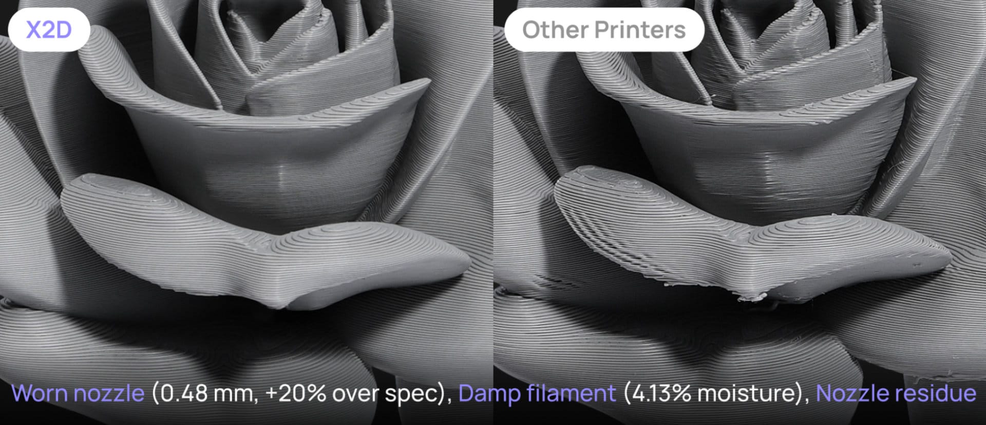 In the X2D, the Dynamic Flow Calibration system simultaneously monitors the state of the extrusion motor, hotend, nozzles, and filament, compensating in real time for every deviation.